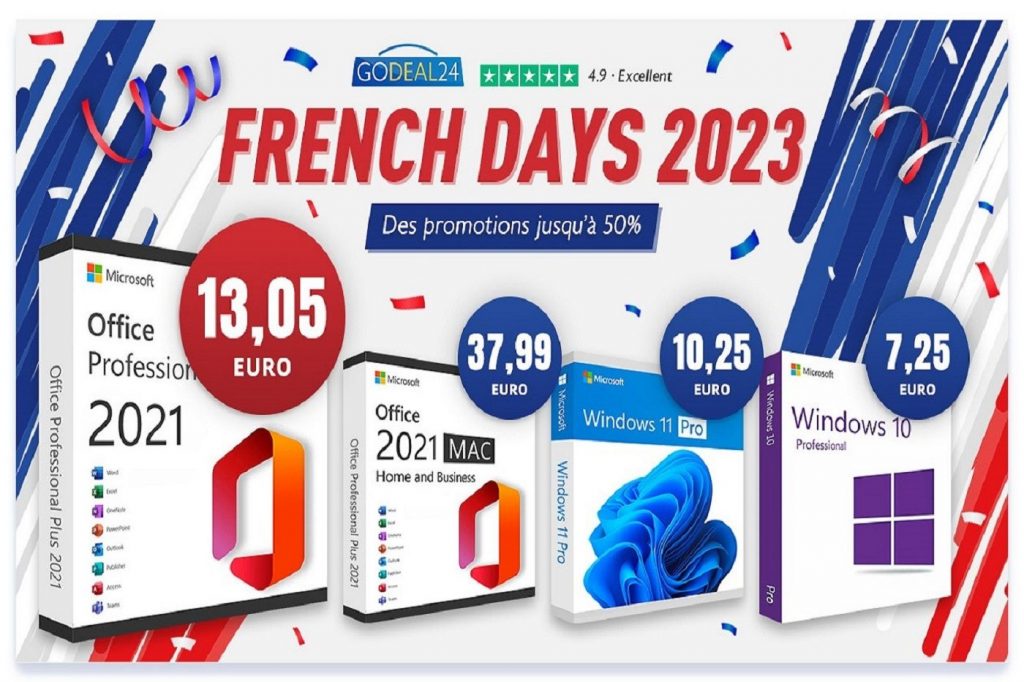 Profitez des French Days chez Godeal24 pour vous équiper d'une clé de licence authentique pour la suite Microsoft Office ou Windows 10 / 11. Bien d'autres logiciels sont, eux aussi, à prix imbattable pendant quelques jours !